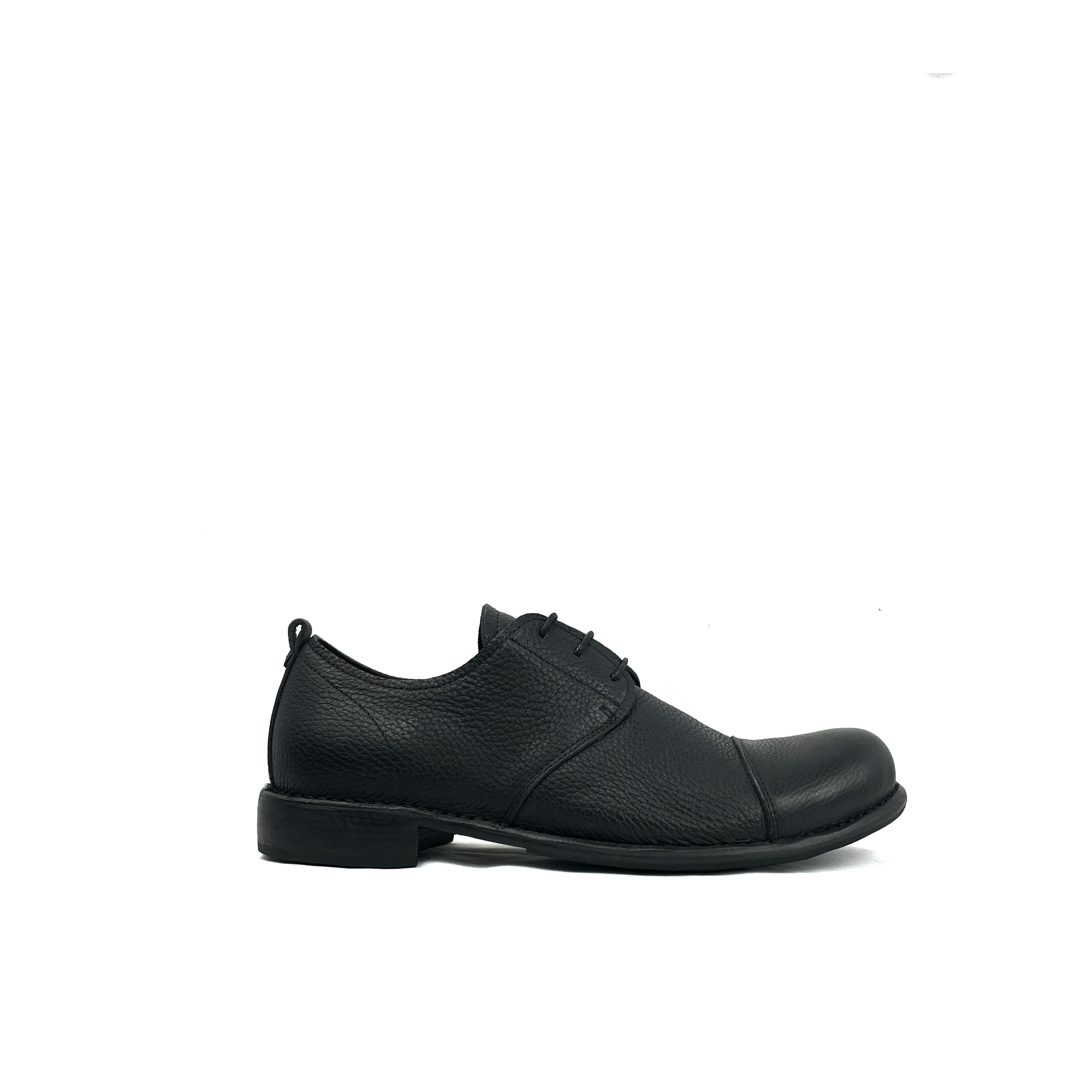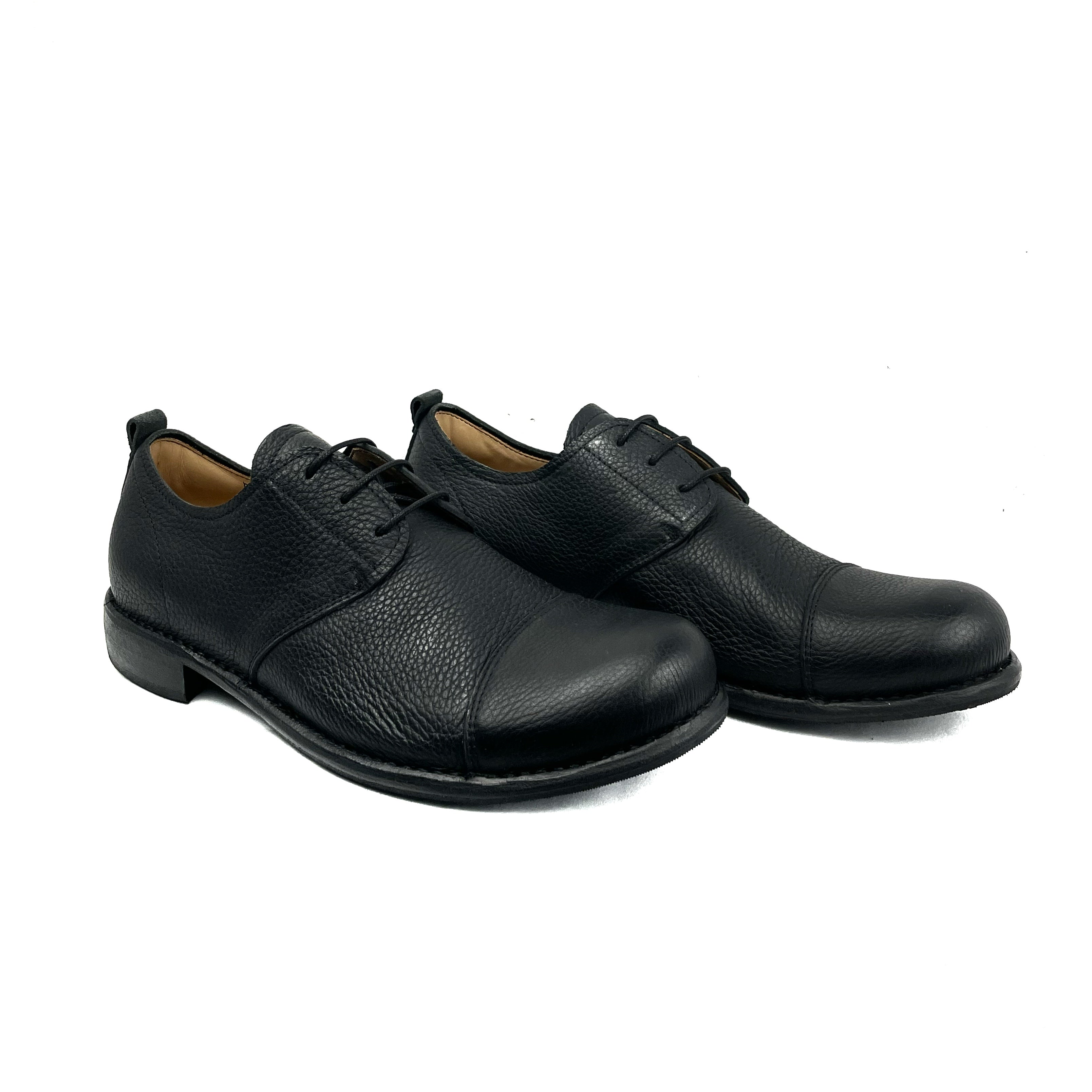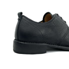 Forma dalla pianta larga e con la punta leggermente all'insù. Tomaia e fodera in pelle di vitello. Suola in cuoio cucita alla tomaia, con antiscivolo in gomma. Una volta indossata, la punta deve rimanere vuota. Tra la fine del dito e la fine della scarpa deve esserci uno spazio di 2 cm