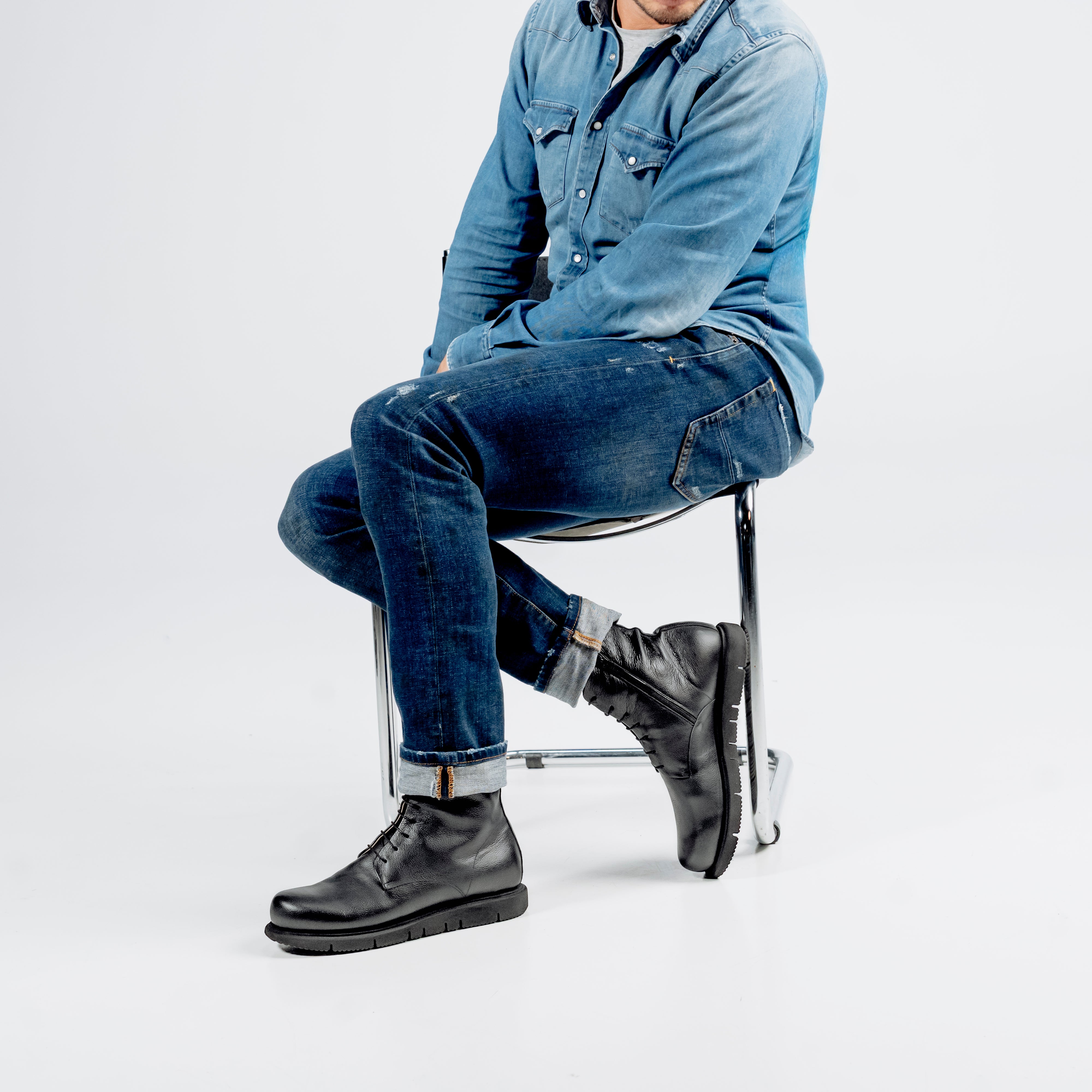 Anfibio comodo, dalla forma rotonda e accogliente. All’interno è previsto un plantare anatomico in lattice (alto 1 cm sul tallone) ricoperto in pelle che, oltre a offrire comfort e scarico del peso corporeo su un materiale soffice, può essere sostituito con un plantare ortopedico personale. Grazie ai lacci puoi calibrare la calzata - a seconda del collo del piede e della caviglia - e tramite la zip puoi velocizzare l'apertura e la chiusura. La suola in gomma Vibram è alta 3 cm sul tallone e 2 cm in pianta