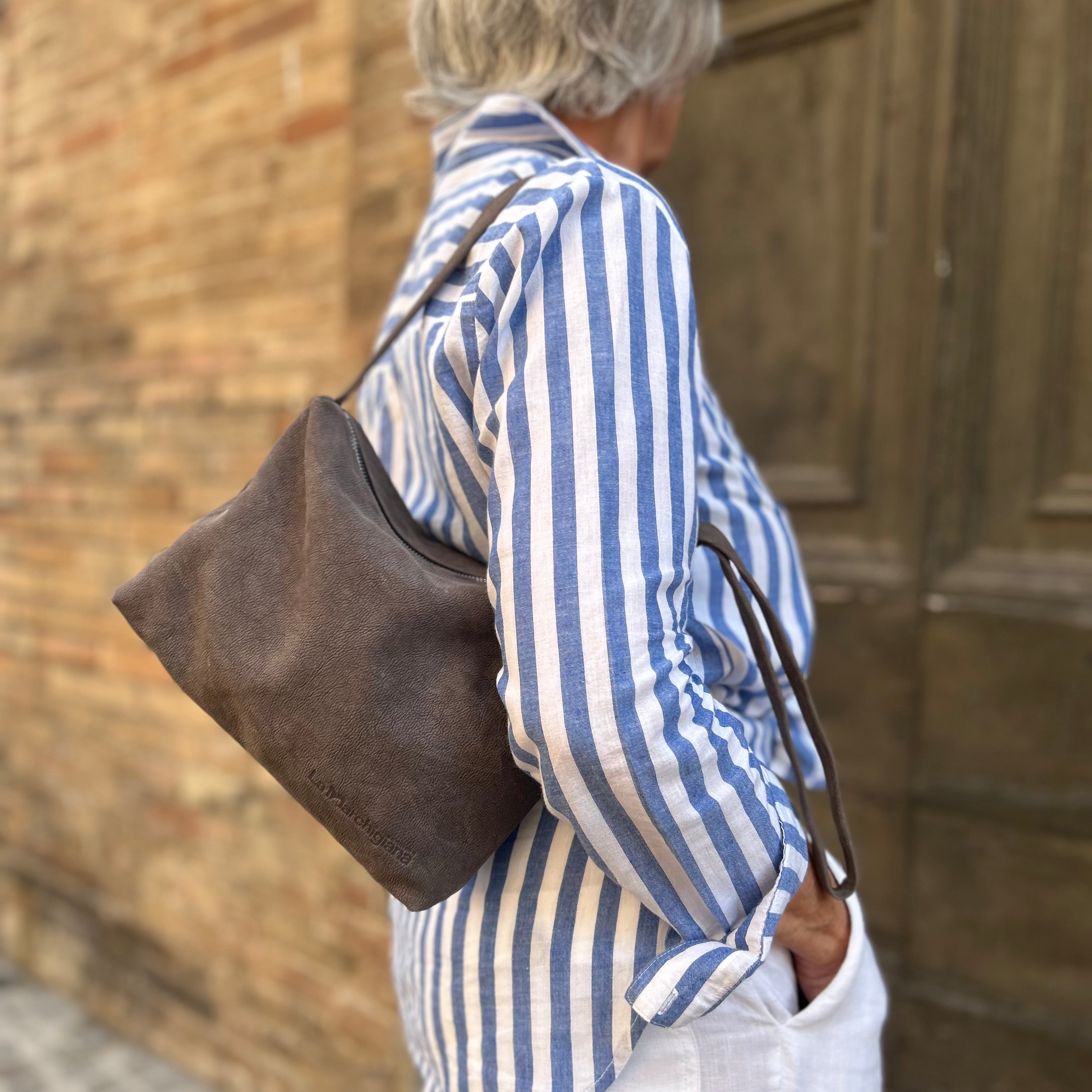 Un cuscino per sentirci coccolate anche in giro per la città. Borsetta super morbida in vitello con tasca interna zip e tracolla in nappa rinforzata. Prende la forma di ciò che gli metti dentro e si accorcia quanto vuoi: basta fare un nodo alla misura che ti serve. È una tracolla che può diventare una pochette a spalla. Da portare in viaggio perché si infila nella valigia o nello zaino