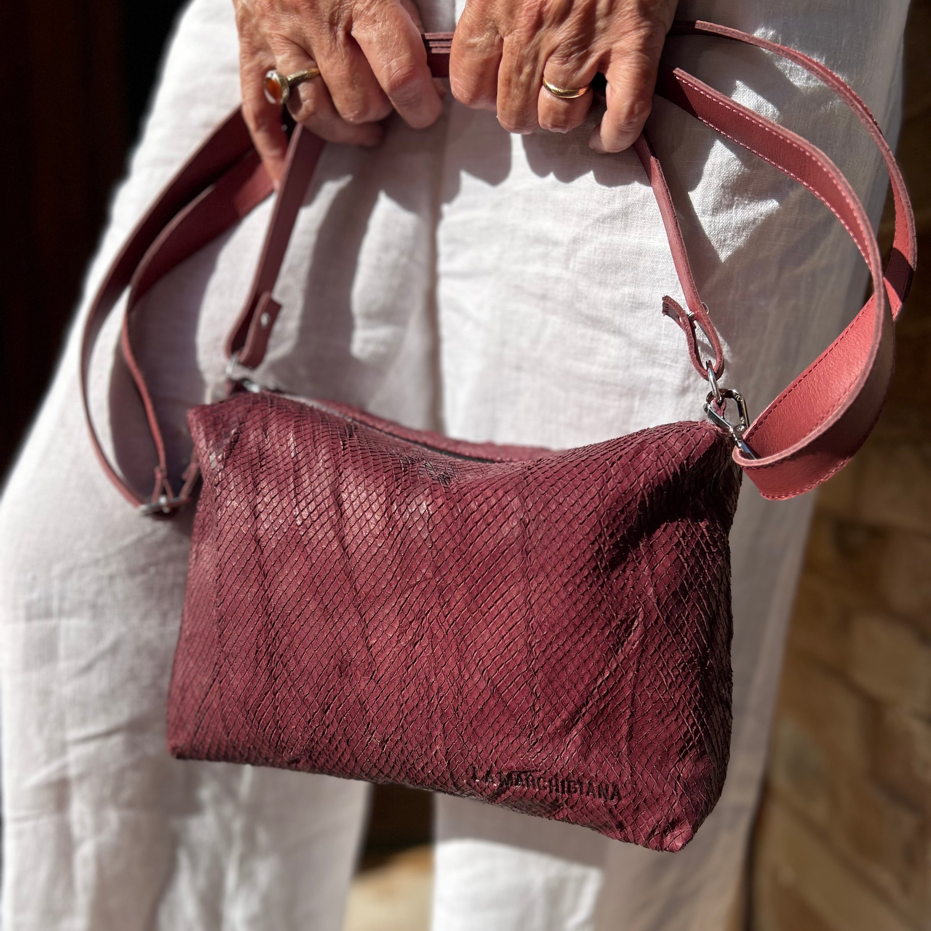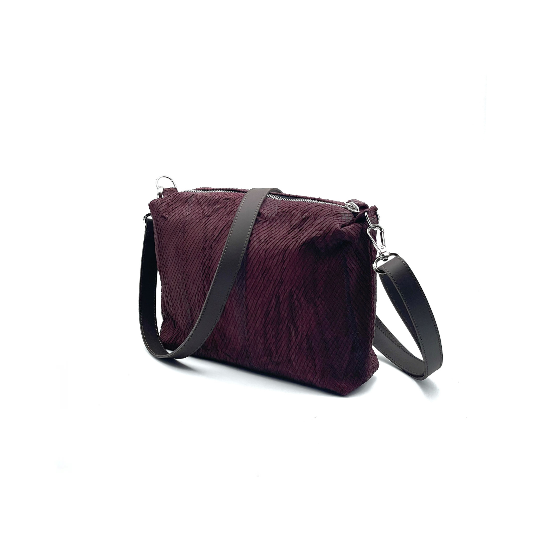 Un cuscino per sentirci coccolate anche in giro per la città. Borsetta super morbida in vitello con tasca interna zip e tracolla in nappa rinforzata. Prende la forma di ciò che gli metti dentro e si accorcia quanto vuoi: basta fare un nodo alla misura che ti serve. È una tracolla che può diventare una pochette a spalla. Da portare in viaggio perché si infila nella valigia o nello zaino