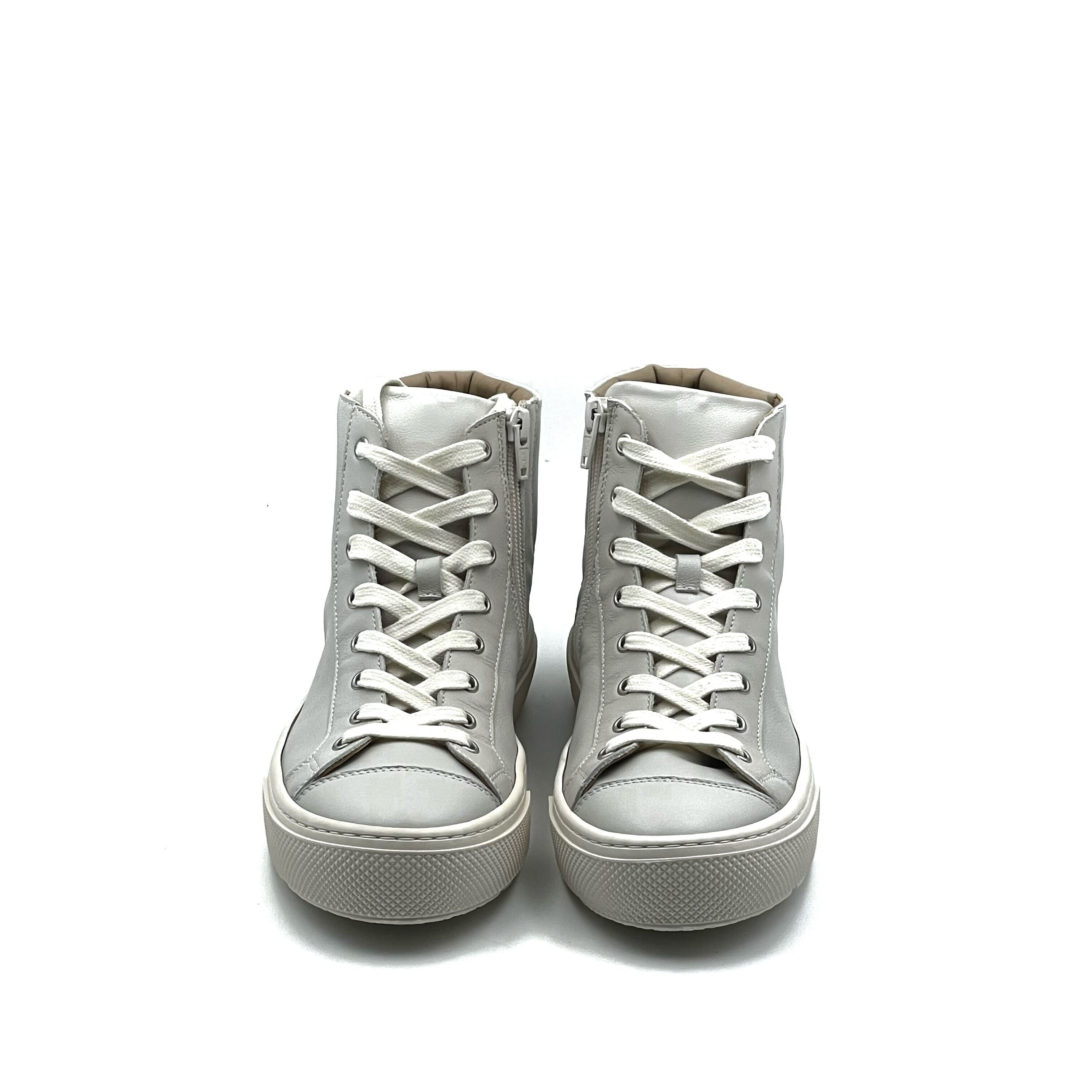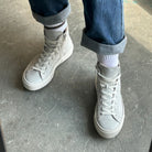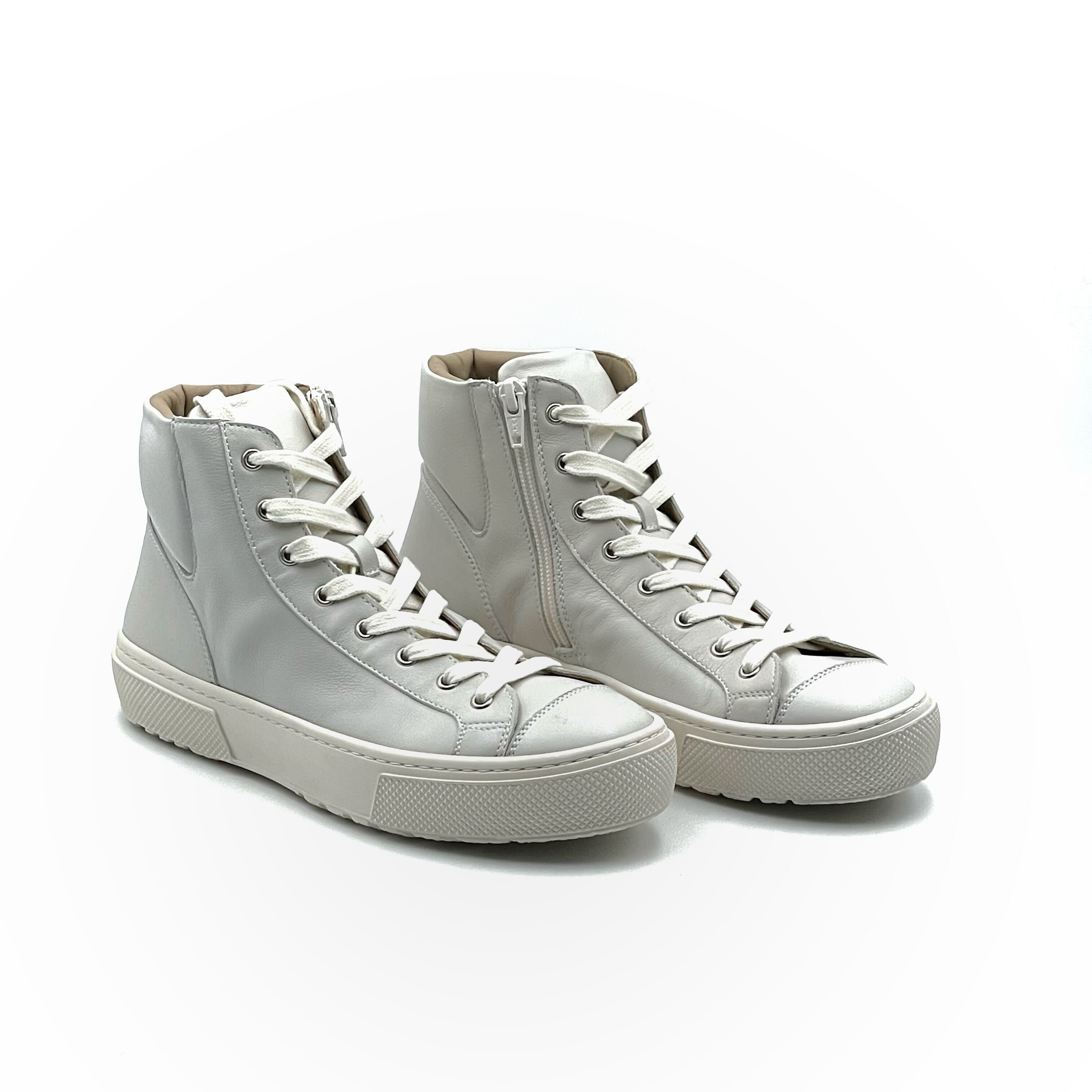 Sono finalmente arrivate le sneakers firmate La Marchigiana: realizzate interamente in pelle, ti salvano l'inverno senza farti rinunciare allo stile. Il gambale è di 13 cm e arriva appena sopra la caviglia. Per rendere l'apertura e la chiusura più veloce abbiamo previsto la zip così, una volta legati i lacci dal metatarso al collo del piede, fate il bel nodino nascosto e non ci pensate più! Linguetta e gambale sono ammorbiditi dalla presenza di gomma piuma e la suola Vibram è cucita intorno alla tomaia. Infine, la super flessibilità delle NYC è data dalla lavorazione a Strobel e dal plantare estraibile in lattice alto 20 mm sul tallone con dislivello in sul davanti di 10 mm. I colori in prevendita saranno il nero, il miele e il latte