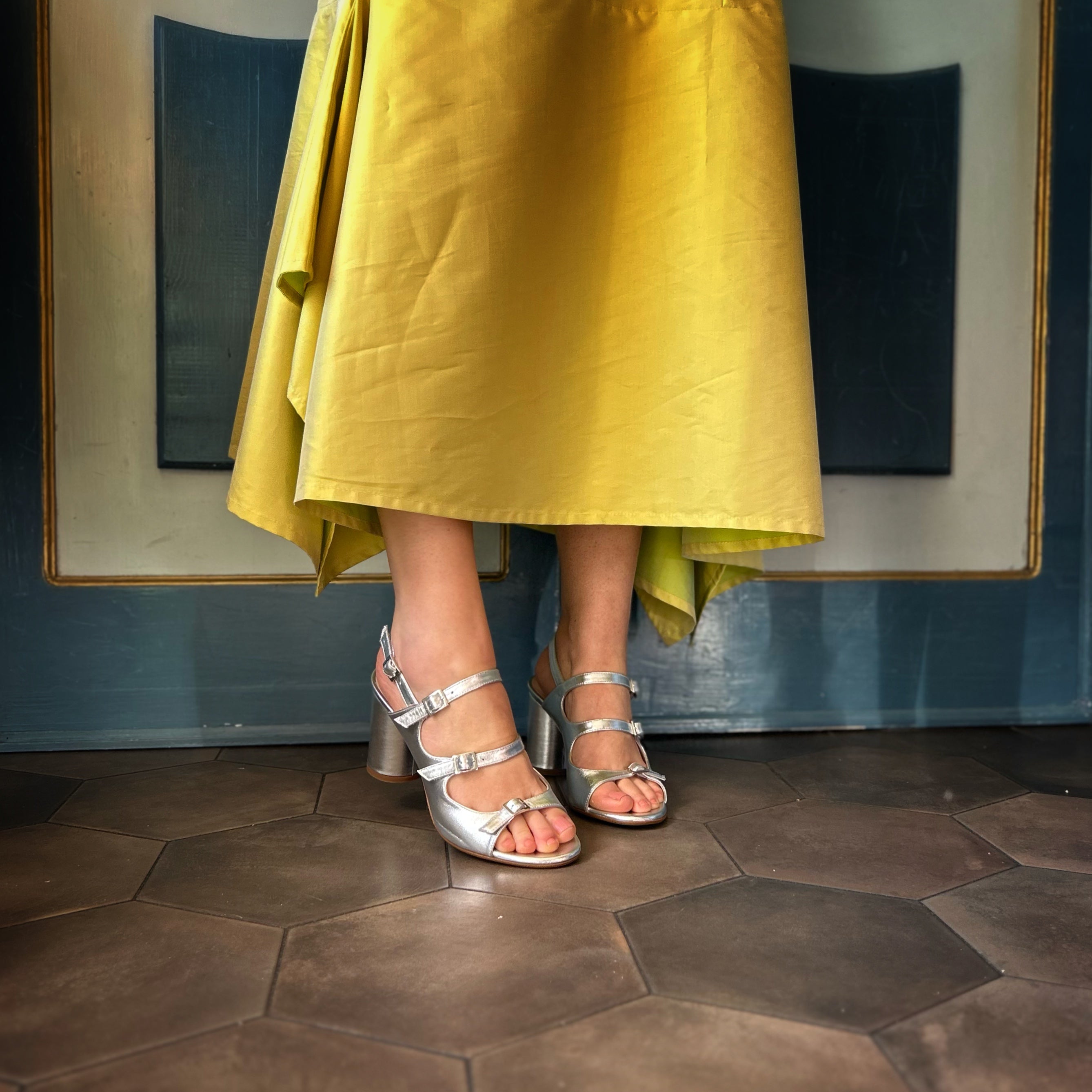 Dalida è il sandalo estivo progettato per tutti i piedini che amano mostrarsi durante dal bella stagione. L'ispirazione è ovviamente la cantante e attrice francese Dalida che con Laissez-moi danser ha celebrato la sua voglia di leggerezza e gioia, il tutto valorizzato dalla sua sensualità matura. La stessa che ritroviamo in questo sandalo dalla punta leggermente affusolata e dalla pianta comoda, per spazio e materiali: i metatarsi infatti poggiano sulla soletta in lattice rivestita in pelle assorbente. Tutta la fodera ha questa proprietà decisiva, per bloccare il piede sudato durante l'estate. A tenere il piede fermo sul dorso sono le tre fibbie appositamente posizionate e adatte a calzare qualsiasi circonferenza: dai piedi più longilinei a quelli più voluminosi. La tomaia super morbida è in nappa. La suola in cuoio è perfetta per la stagione dei matrimoni e delle feste all'aperto. Il tacco è alto 8 cm ma essendo rotondo e con un diametro di 5 cm risulta super comodo e saldo a terra. Essere femminili non è mai stato così confortevole.